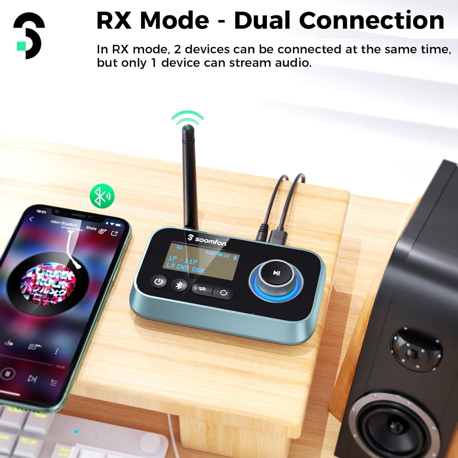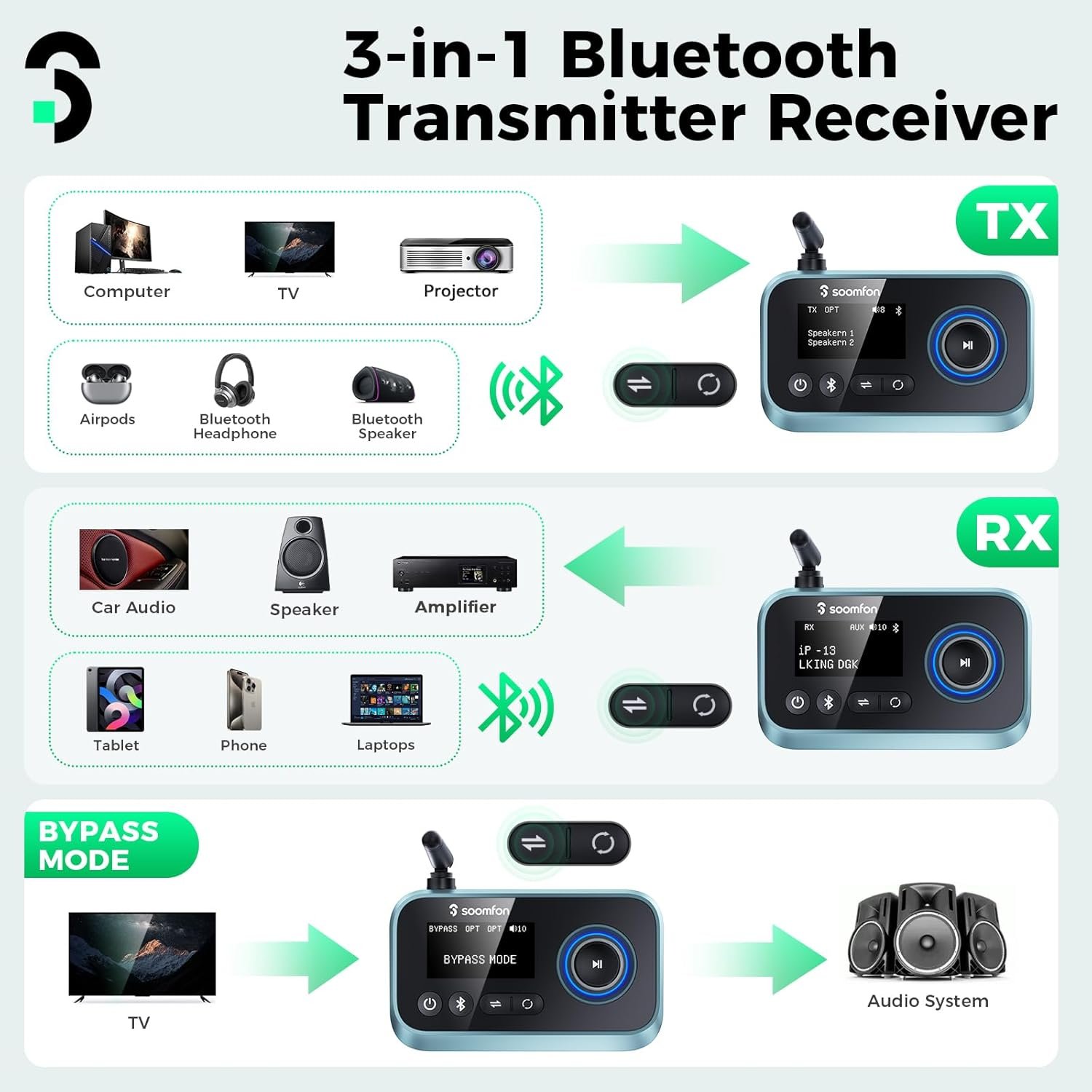 - 3 in 1 Bluetooth Transmitter Receiver – TX Mode: transmit audio from TV or PC to Bluetooth headphones. RX Mode: stream audio from your phone to wired speakers or other HiFi system. Bypass Mode: This Bluetooth adapter for TV supports connection directly, allowing you to enjoy the TV via a non-Bluetooth home stereo.