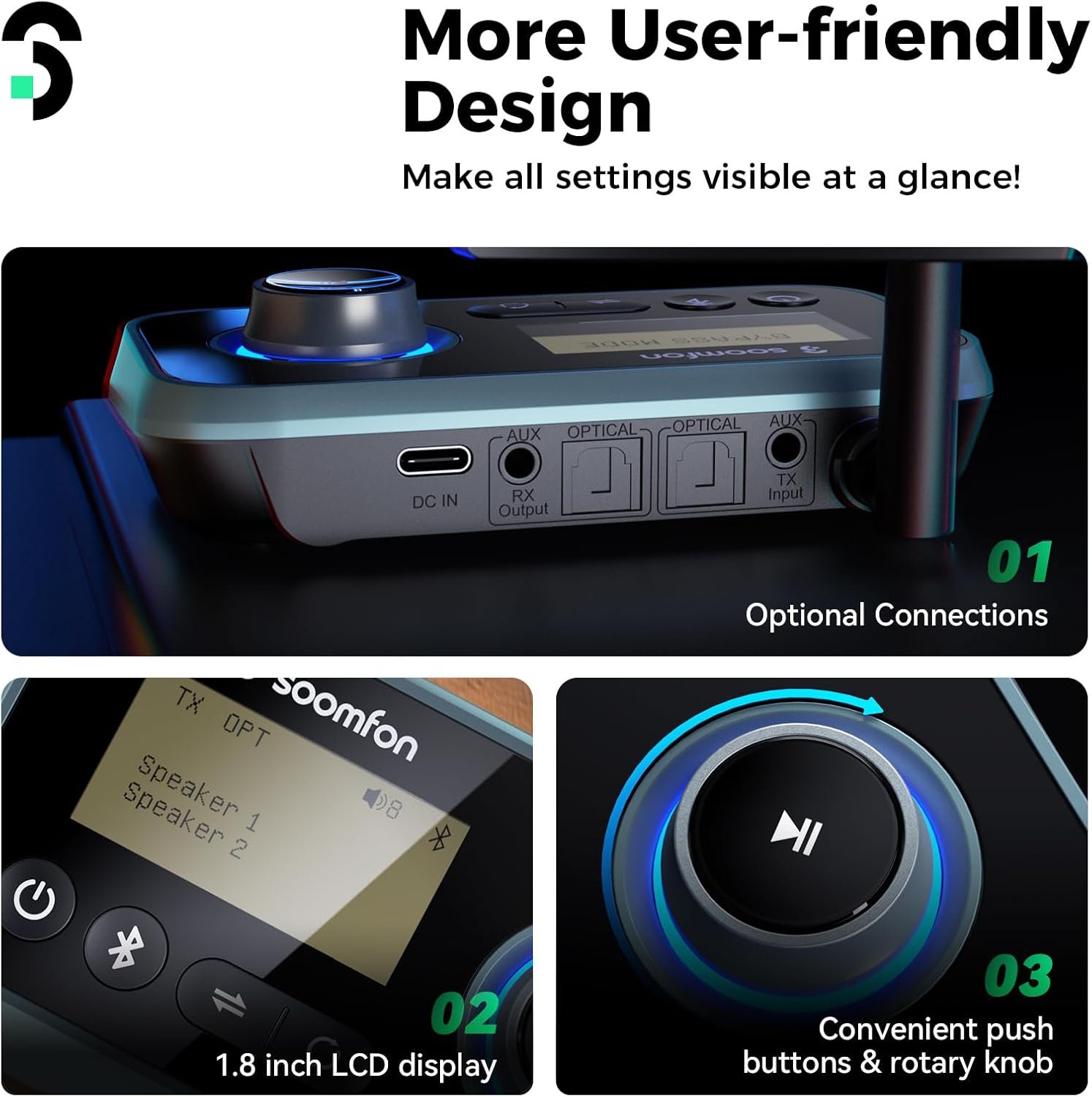 - 【1.8” LCD Display & Rotary Knob】 The TV Bluetooth transmitter for headphones is equipped with a 1.8 inch LCD screen, which allows you to clearly see the device name and the current working status of the Bluetooth adapter. In addition, you can easily adjust the volume, switch devices and play/pause via the rotary knob.